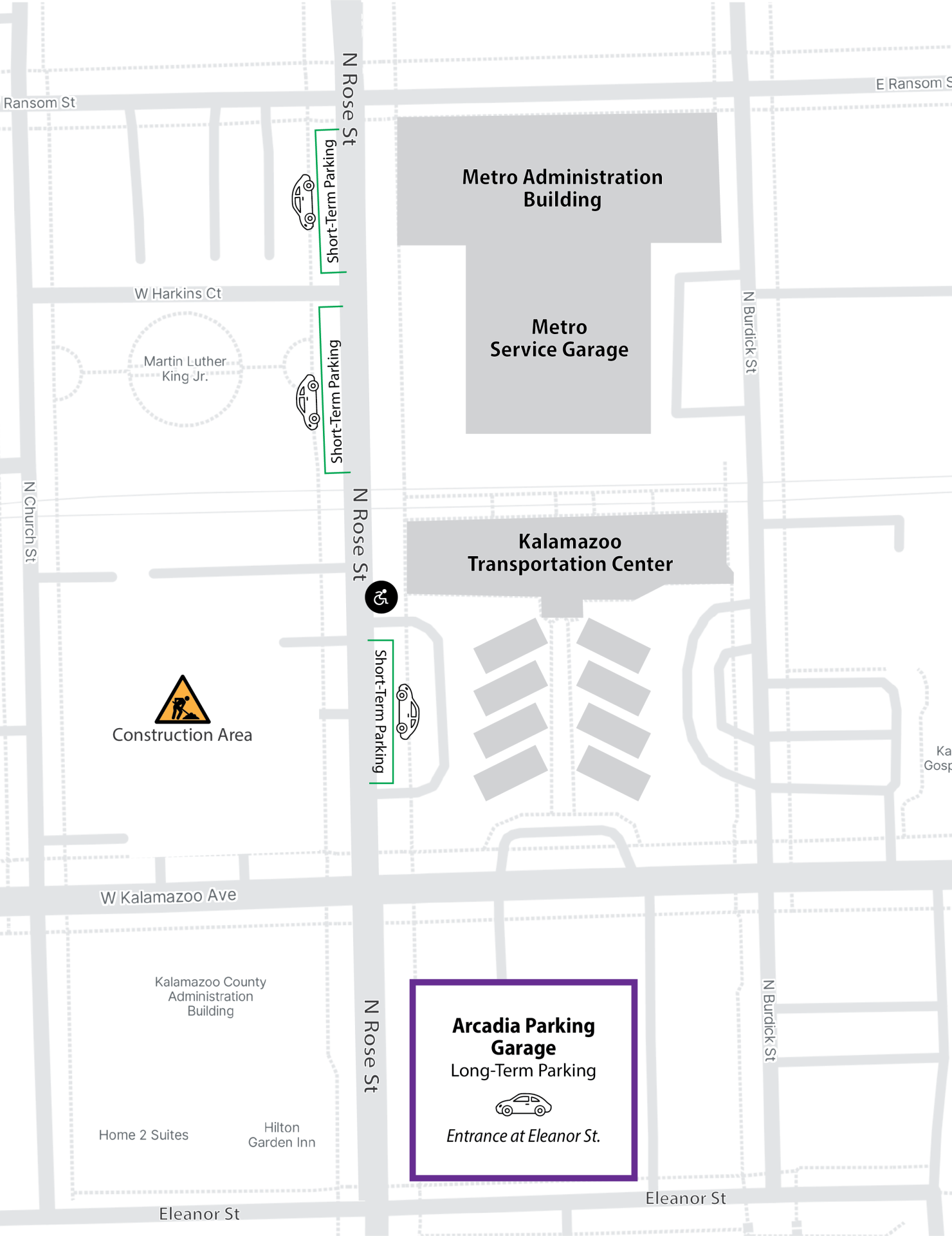 Starting January 16, 2026, these one-hour spots will be available for patrons with business at the KTC. Spots will be located between the bus entrance & exit to the KTC, as well as along Martin Luther King, Jr. park. For those who do not wish to utilize street parking, or for anyone with long-term travel plans, parking is available in the Arcadia Ramp located along W. Kalamazoo Ave.